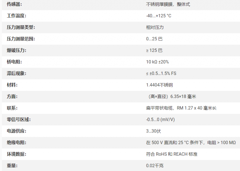 B+B 不锈钢压力传感器相对压力 | 0…25 bar系列