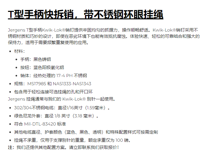 Jergens T型手柄快拆销带不锈钢环眼挂绳系列